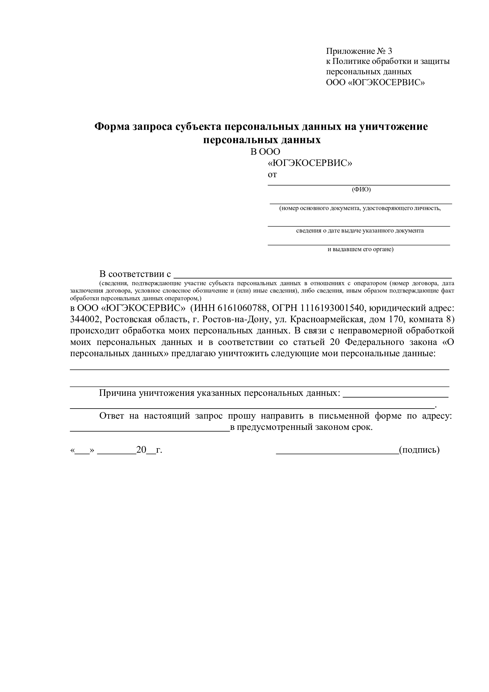 6.10. Для исключения неправомерной обработки данных субъект (или представитель) заполняет форму запроса на уничтожение (Приложение 3 или 7) и направляет его в порядке, предусмотренном п. 6.8.